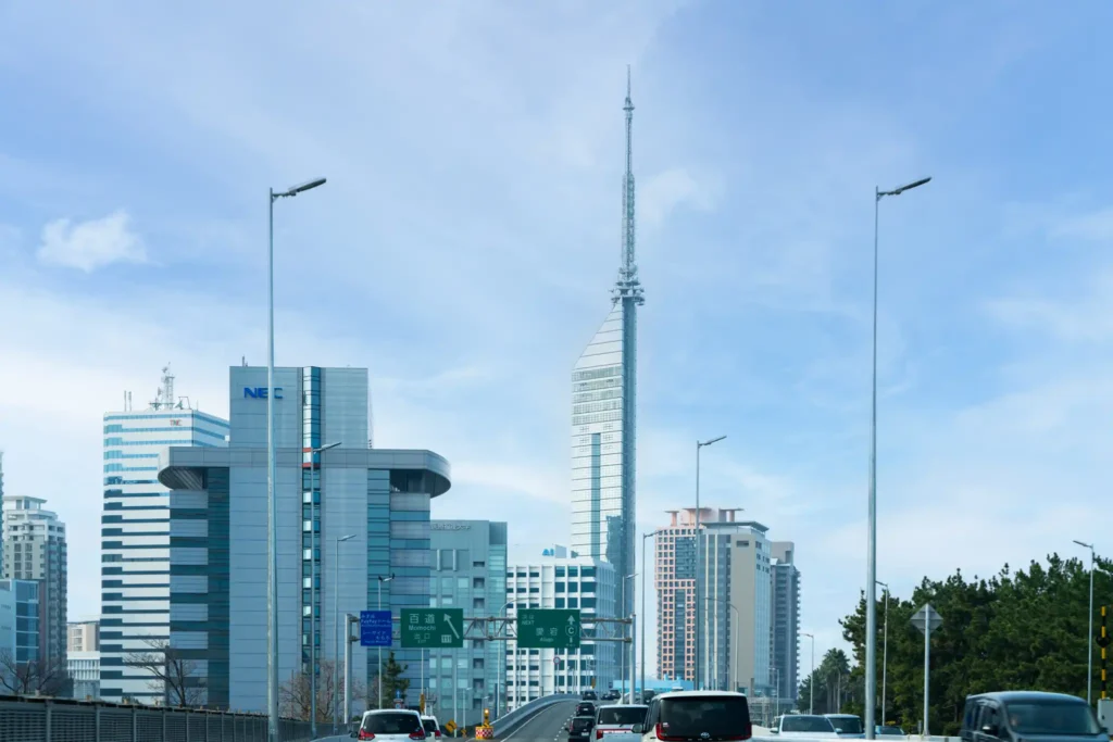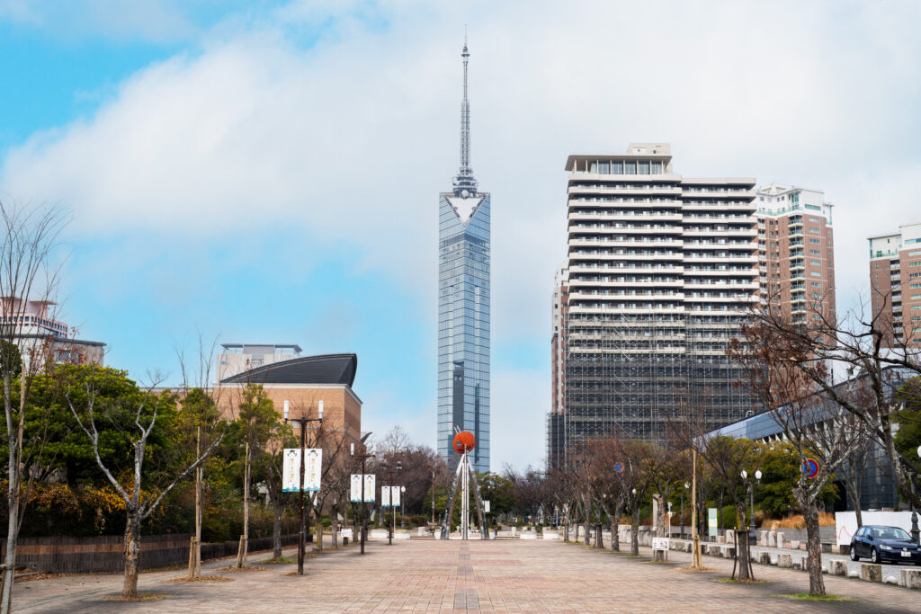 福岡市博物館を背に、福岡タワーを正面から捉えた構図。