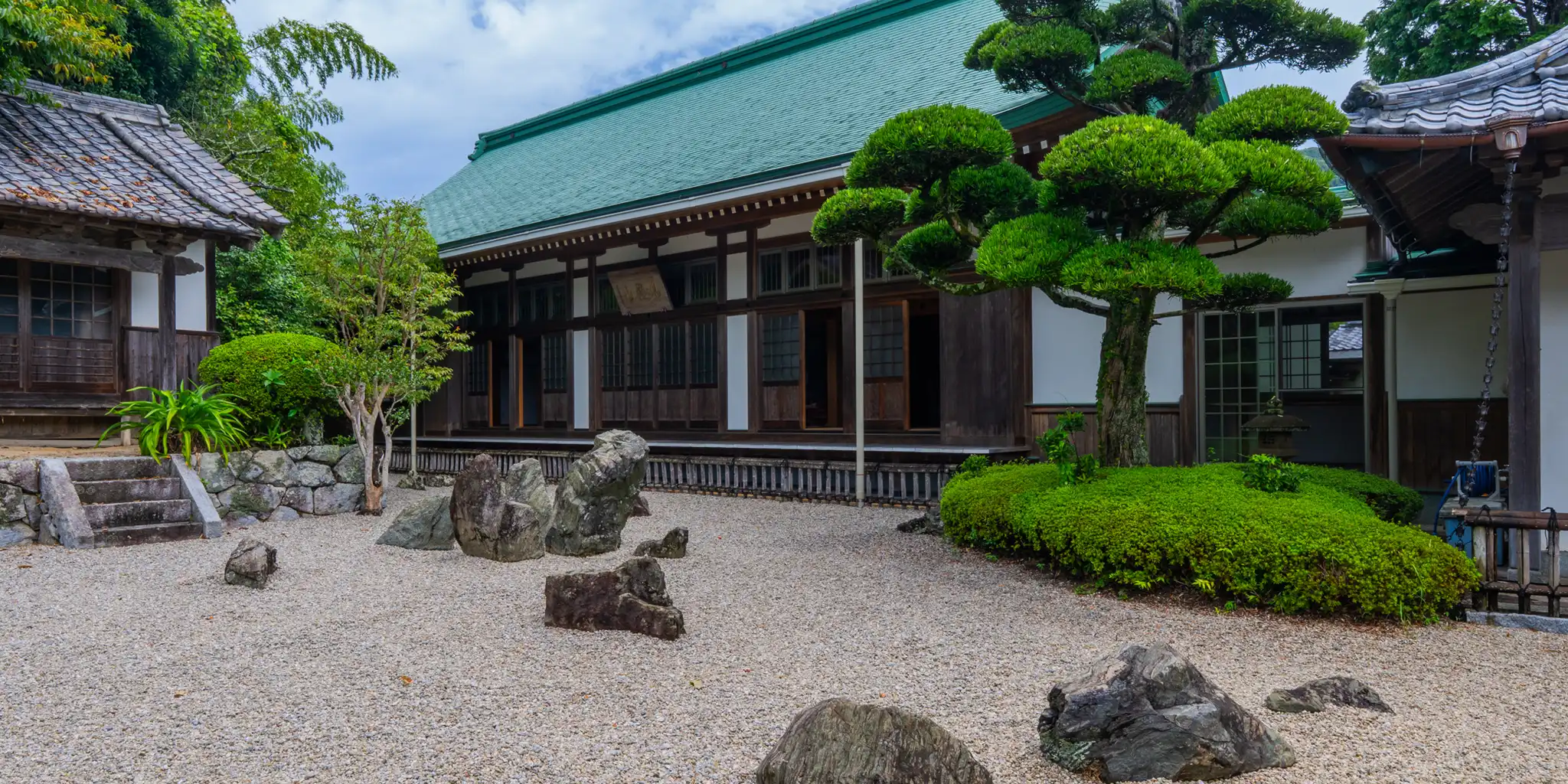境内には枯山水の石庭があり、竜の形をした庭石や雲を思わせる白い敷石が印象的です。